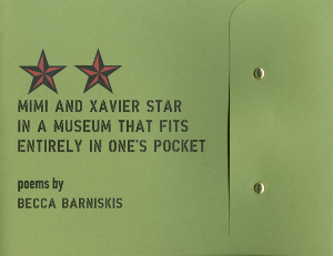 In this dramatic poem in three acts, Barniskis introduces readers to Mimi Sprig and Xavier Box, tiny adversaries engaged in "an almost secret war." Their poetic monologues shimmer with longing as they circle, listening for signs of life and learning to read each other. Mimi and Xavier Star in a Museum That Fits Entirely in One's Pocket was a finalist in the Anomalous Press Poetry Chapbook Contest, judged by Cole Swensen, and is being co-released as an LP with music by composer Nick Jaffe.