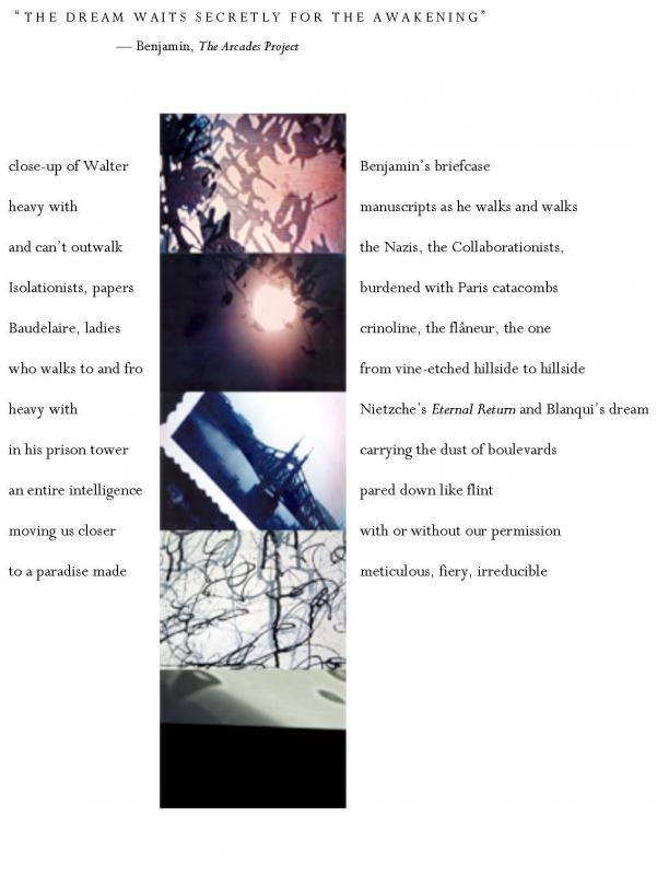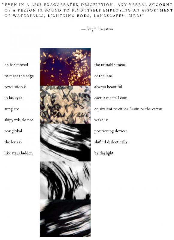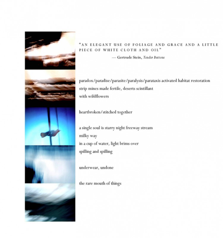 Meredith Stricker’s newest book is mistake, selected by Rosmarie Waldrop for Caketrain Press. She is also the author of Alphabet Theater, a collection of mixed-media performance poetry from Wesleyan and Tenderness Shore, which received the National Poetry Series Award. She works as a poet, designer and artist with visual poetry collaborative, a studio that focuses on architecture in Big Sur and projects to bring together artists, writers, musicians and experimental forms.